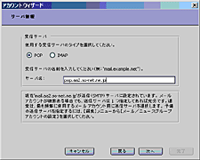 ④「サーバ情報」画面で「受信サーバのタイプ」を「POP」、「サーバ名」を基本メールボックスアドレスの受信サーバ名を入力します。