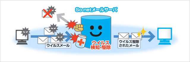 - ・サービスの性質上、すべてのウイルスを迅速に検出できるわけではありません。新種のウイルスに対してもできる限り早く対応するようにはしていますが、未知 のウイルスに対しては検知できない場合もあります。また、添付ファイルの形式によっては、サービスが対応できない場合もあります。添付ファイル付きのメー ルが来た場合や、親しい人からのメールでもむやみに添付ファイルを開くことは避け、ウイルスに感染しないよう、日ごろから心がけるようにしてください。