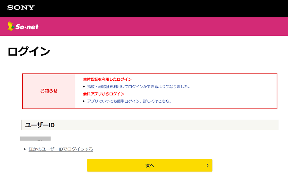 ログイン画面でSo-netユーザーID/パスワードを入力
