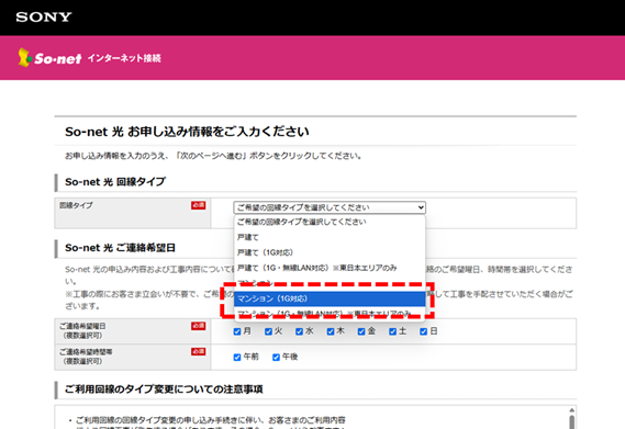 「So-net 光 回線タイプ」の「マンション(1G対応)」をクリックします
