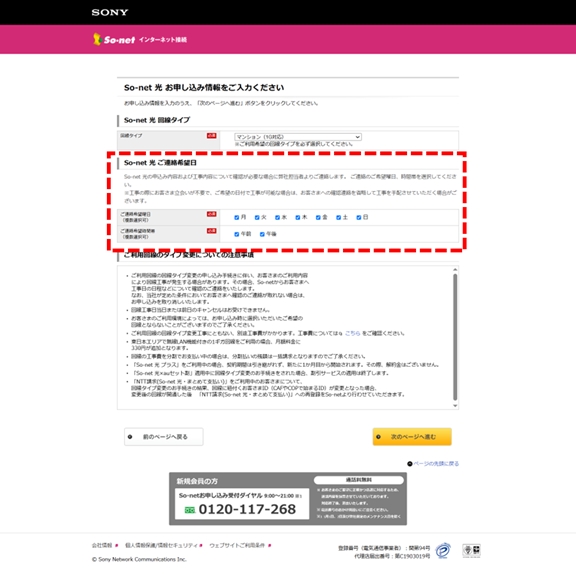 「So-net 光 ご連絡希望日」から「ご連絡希望日」と「ご連絡希望時間帯」を選択して
