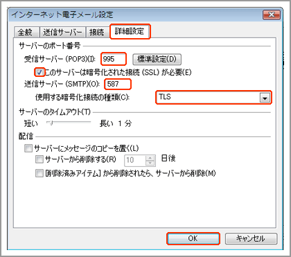 [詳細設定]のタブをクリックして、各項目を入力/選択してください。確認後、[OK]をクリックしてください。これで、Microsoft Outlook 2007の設定は終了です。