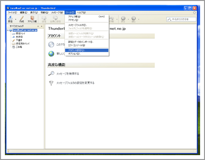 Thunderbird 2.0を起動し、設定をするメールアドレスのアカウントを選択して、[ツール]-[アカウント設定]を選択してください。