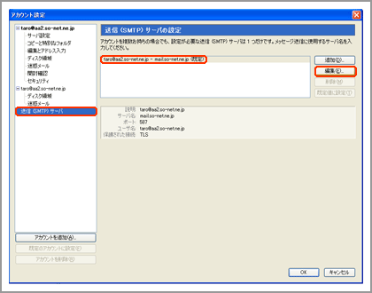 [送信(SMTP)サーバ]を選択し、設定をするメールアドレスのアカウントを選択して、[編集]をクリックしてください。