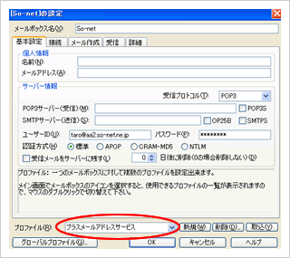 [新規]ボタンをクリックして、管理用に覚えやすい名前(プロファイル)を入力してください。下図では、例として〔プラスメールアドレスサービス〕と入力しています。