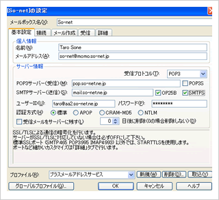 - ※〔so-net.jp〕と〔so-net.ne.jp〕を間違えないように設定をお願いいたします。誤った設定の場合、送信先へメールが届かない場合がありますので、ご注意ください。