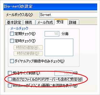 [受信]のタブをクリックしてから、「他のプロファイルのPOP3サーバーも含めて受信」のチェックを外してください。