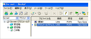 - プラスメールアドレスサービスで取得したメールアドレスを送信メールアドレスとする場合、メールソフトの送信者設定を変更する必要があります。設定方法を、実際の画面に沿ってご説明します。