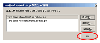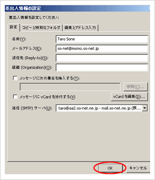 「名前」の欄に送信者としてメールに表示させたい名前を、「メールアドレス」の欄にプラスメールアドレスサービスで取得したメールアドレスを入力してください。右図では、例として〔Taro Sone〕および〔so-net@momo.so-net.jp〕と入力しています。入力したら、[OK]ボタンをクリックしてください。