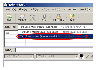 「差出人」の欄で、プラスメールアドレスサービスで取得したメールアドレスを選択してください。右図では、例として〔so-net@momo.so-net.jp〕を選択しています。