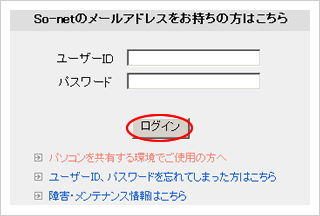 - So-net Webメールのログイン画面に移ります。ユーザーID(例:taro_s@aa2)とパスワードを入力して、[ログイン]ボタンをクリックしてください。
