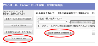 [プラスメールアドレス]ボタンをクリックしてください。利用されるお名前の入力およびメールアドレスの選択をして、[送信者を編集または登録する]ボタンをクリックしてください。以上で、So-net Webメールのメール送信設定は完了です。