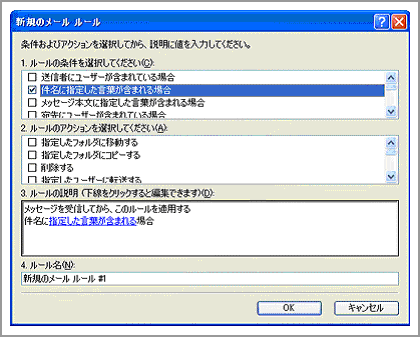 [1.ルールの条件を選択してください]の欄で[件名に指定した言葉が含まれる場合]にチェックを入れてください。[3.ルールの説明]の欄に[指定した言葉が含まれる]が表示されますので、これをクリックしてください。