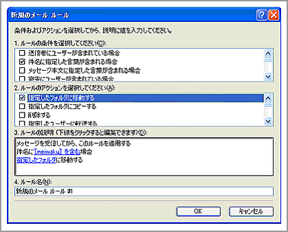 [2.ルールのアクションを選択してください]の欄で[指定したフォルダに移動する]にチェックを入れてください。[3.ルールの説明]の欄に[指定したフォルダ]が表示されますので、これをクリックしてください。