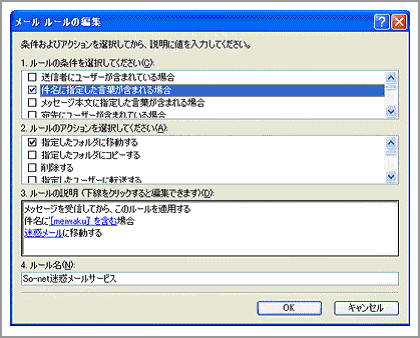[4.ルール名]の欄に、お好きな名前を入力してください。右図では、例として[So-net迷惑メールサービス]と入力しています。入力したら、[OK]ボタンをクリックしてください。