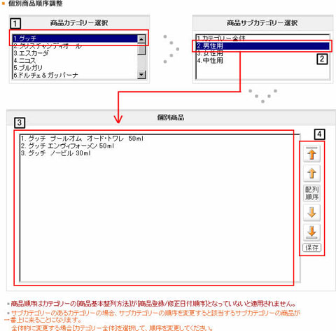 - カテゴリー及びサブカテゴリーを選択すると、そこに含まれている商品一覧が表示されます。順序を変更したい商品を選択してください。