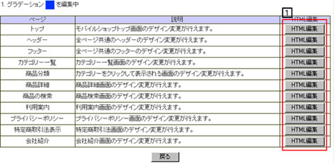 (1)の「編集する」ボタンを押すと、下記の編集可能ページ一覧表に遷移しますので、編集したいページの「HTML編集」ボタンを押します。