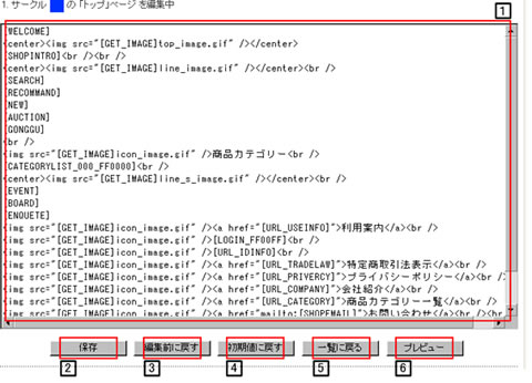 「トップページ」の「HTML編集」ボタンを押すと、下記の編集画面となります。