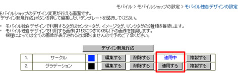 - 「適用する」ボタンを押すと、編集した独自デザインの内容をモバイルショップへと適用することができます。適用中のリストは「適用中」と表示され、今まで表示されていたデザインテンプレートは一時的に無効になります。