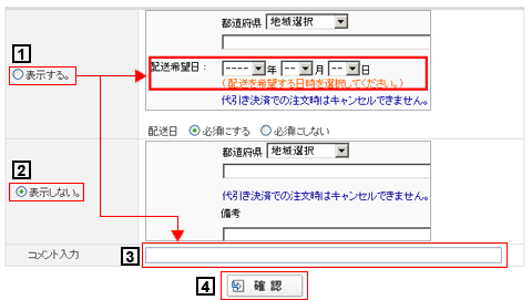 - 「表示する」にチェックを入れた場合、配送希望日の下にコメントを表示することができます。