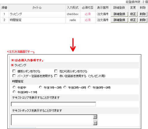 「注文書項目の設定」は注文決済画面の一番初めに表示される「商品の送付先」の追加事項を設定できます。