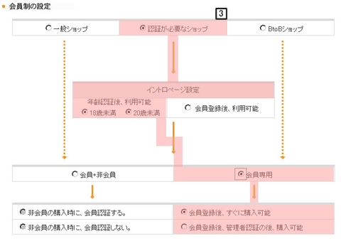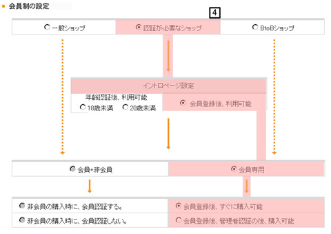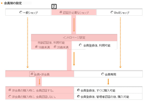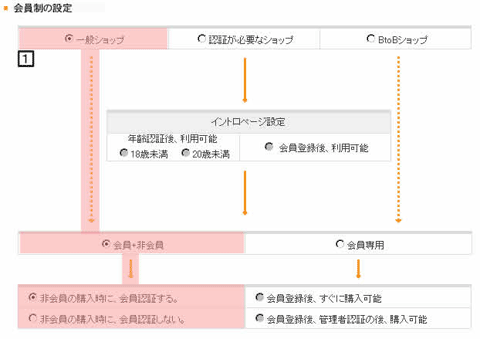 会員制ショップや年齢認証画面を表示したりBtoBショップ(管理者の認証が必要)への機能転換などの設定が行なえます。