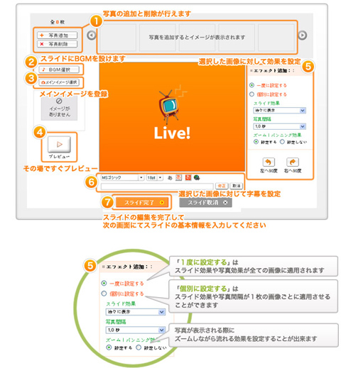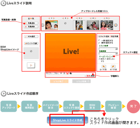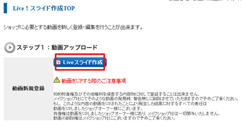 「ShopLiveスライド作成」ボタンを押すと「Live!スライド作成TOP」画面へと進みます。