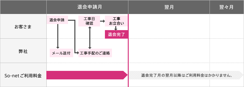お客さまと弊社で取り決めさせていただく廃止工事月の月末の退会となります。