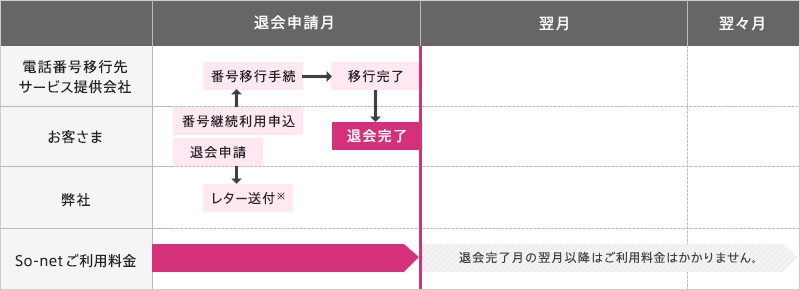 「So-net 光 電話」の電話番号継続手続き完了後、お客さまと弊社で取り決めさせていただく廃止工事月の月末の退会となります。
